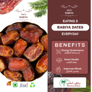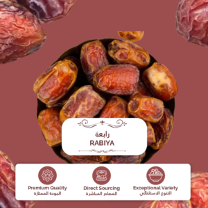 Rabiya dates are known for their sweet, mildly chewy texture. They offer a balanced flavor profile that combines rich sweetness with a touch of nuttiness.