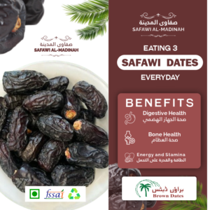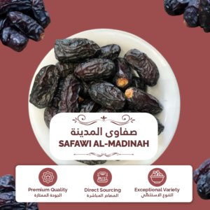 Safawi Al-Madinah dates are known for their dark, glossy skin and slightly tangy, sweet flavor. Their chewy texture makes them a popular choice for snacking and culinary uses.